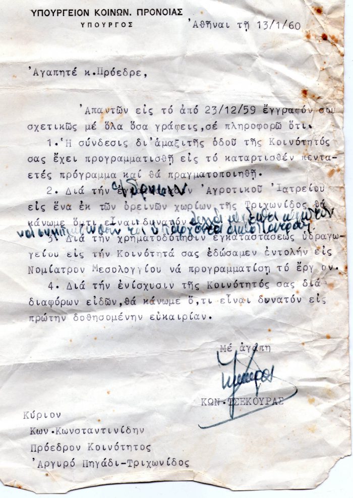 - Έγγραφο – απάντηση Υπουργείου Κοινωνικής πρόνοιας του 1960 σε έγγραφο της Κοινότητας για αμαξιτό δρόμο, υδραγωγείο, Αγροτικό Ιατρείο