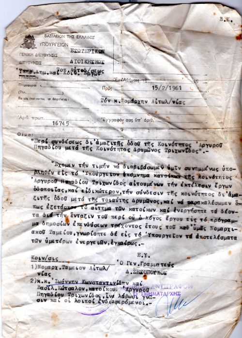 Σε άλλο έγγραφο του Υπουργείου Εσωτερικών της 15/02/1961 προς τον Νομάρχη Αιτωλ/νιας ύστερα από υπόμνημα των κατοίκων του χωριού, διαβάζουμε: