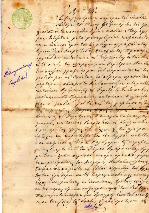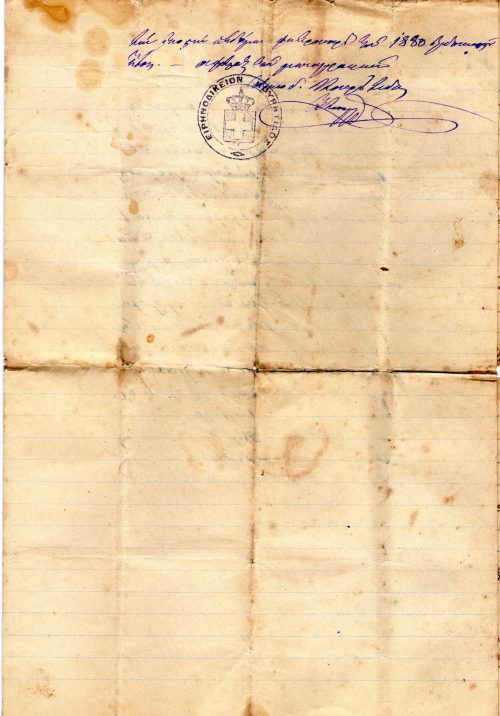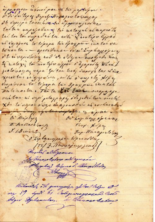 ο δε δεύτερος Δημήτριος Παναγιωτόπουλος ότι επραγματοποίησε την αγοραπωλησίαν ταύτην, παρέλαβεν εις την κατοχήν και κυριότητα τούτου τον πωληθέντα αυτώ ως ανωτέρω αγρόν και επλήρωσε το τίμημα των δραχμών εκατόν πεντήκοντα, προσέθηκαν δε οι Συμβαλλόμενοι ότι εν περιπτώσει καθ’ ήν ήθελεν αποβληθεί βιαίως εκ του ανωτέρω αγρού ο αγοραστής Παναγιωτόπουλος παρά τρίτου τινός, υπόσχεται και υποχρεούται να πληρώσει αυτώ ο πωλητής Φίφης διπλάσιον το τίμημα των δραχμών εκατόν πεντήκοντα. …….. Τούτων συνομολογηθέντων και περί μεταγραφής οδηγηθέντων συνετάχθη το παρόν όπερ …. αναγνωσθέν και επιβεβαιωθέν ; ……… υπογράφεται …….. ……………………….